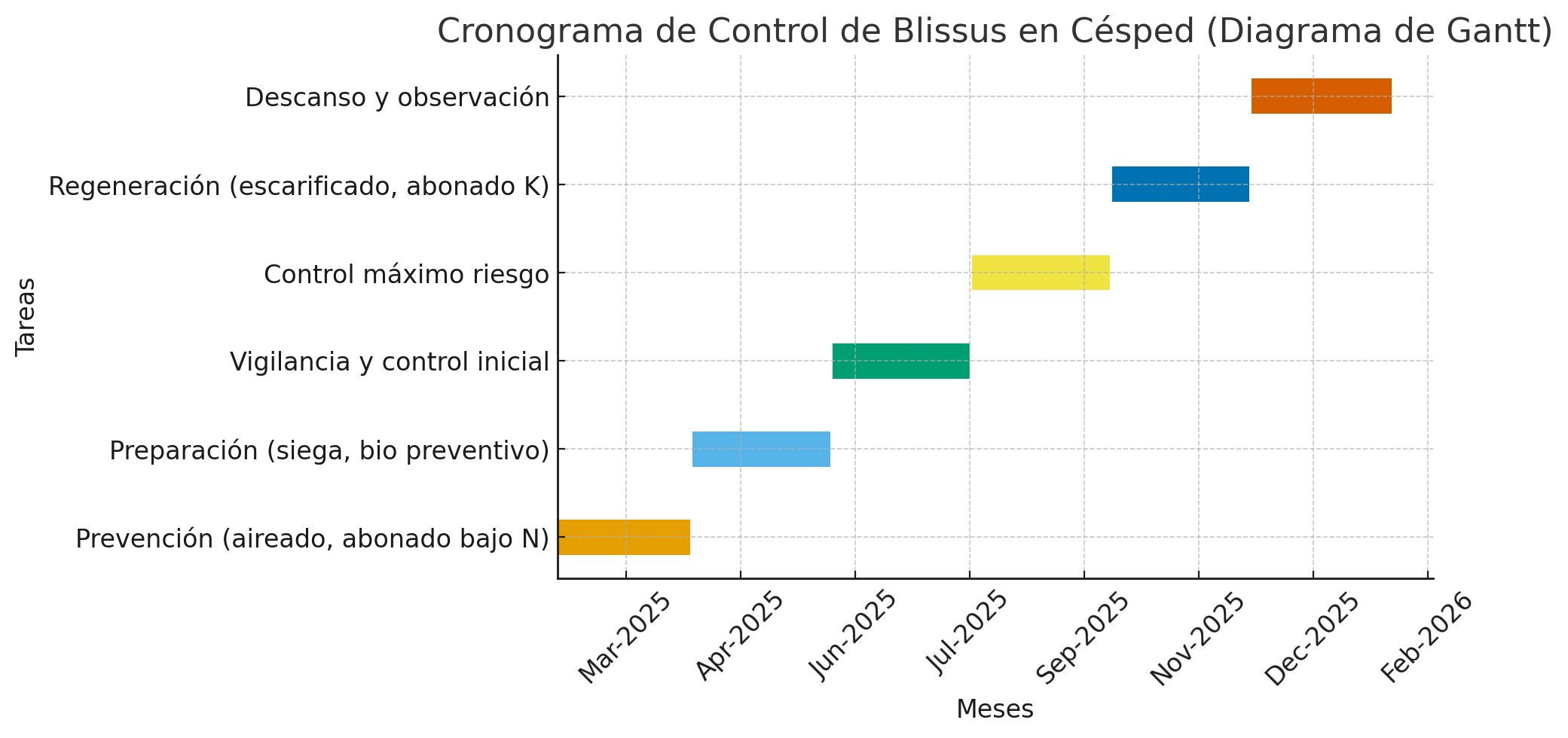 Durante la primavera se recomienda reforzar la salud del césped mediante abonados equilibrados, siega a altura moderada y riegos profundos pero espaciados, evitando el exceso de nitrógeno. Esto fortalece las raíces y dificulta el establecimiento de chinches. En verano conviene intensificar la vigilancia con el test del cubo y, en caso de detectar poblaciones elevadas, se aplican tratamientos biológicos o químicos. En otoño, el objetivo es regenerar el césped con aireación y escarificado, reduciendo restos orgánicos que sirven de refugio.